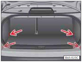 En el maletero van dispuestas cuatro anillas (véanse las flechas) para fijar objetos. Dos de las anillas se encuentran a los lados derecho e izquierdo, respectivamente, de la parte delantera del maletero. Las otras dos van junto al borde de carga del maletero (véase figura).